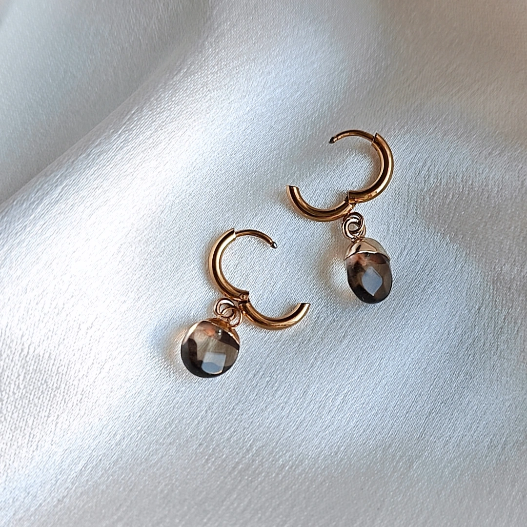 Näissä korvakoruissa yhdistyvät kullan lämpö ja savukvartsin hillitty ruskeanharmaa sävy. Savukvartsi on voimakas maadoittava kivi, joka tunnetaan tasapainottavista ja rauhoittavista ominaisuuksistaan. Sen läpikuultava sävy tuo koruihin hienostuneen ja ajattoman ilmeen.