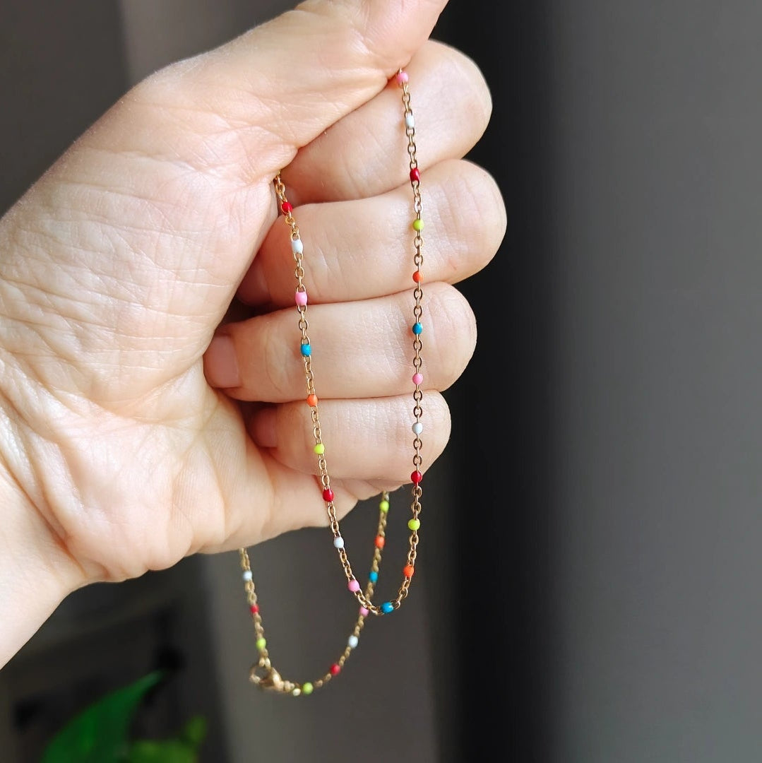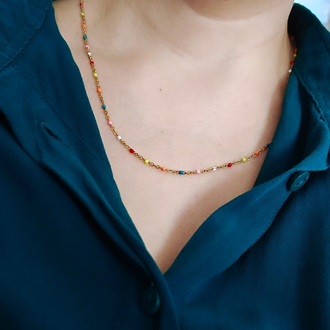 Värikkäitä yksityiskohtia sisältävä kaulakoru on materiaaliltaan kullattua ruostumatonta terästä. Ketjun pituus on 50 cm.